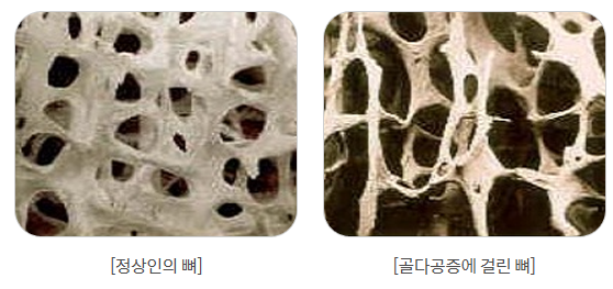 골다공증은 뼈의 밀도와 구조가 저하되어 쉽게 부러지는 만성 질환입니다. 건강한 뼈는 해면골 구조가 촘촘하고 단단하지만, 골다공증이 생기면 이 구조가 성긴 그물처럼 변해 골밀도가 급격히 낮아집니다. 결과적으로 기침, 재채기 같은 가벼운 자극에도 골절이 발생할 수 있습니다.