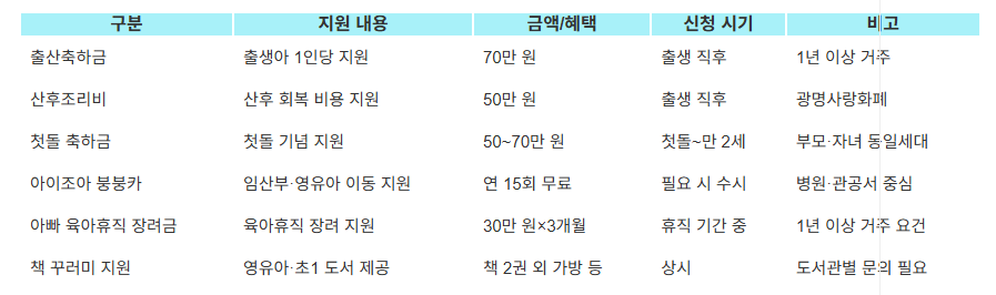 | 첫째 아이 | 60만 원 | 첫돌 기준일 광명시 거주 |