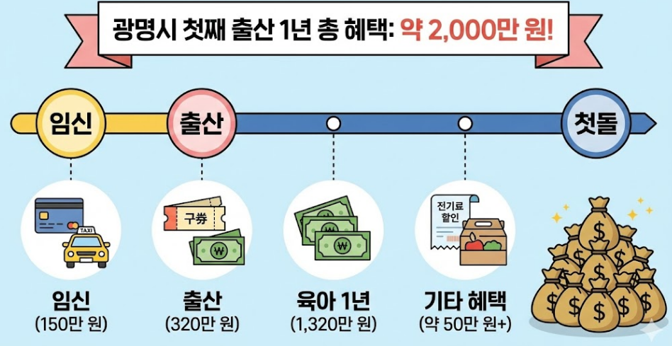 2026년은 혜택이 역대급입니다. 정부 기본 지원금에 경기도와 광명시가 더해주는 '알짜배기 추가 혜택'까지 싹 긁어모으면, 임신 확인 순간부터 아이가 첫돌을 맞이할 때까지 약 2,000만 원 상당의 지원을 챙길 수 있습니다.