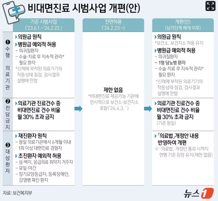 변경된 시범사업 기준에 따르면 비대면진료는 의원급 중심으로 제한되며,